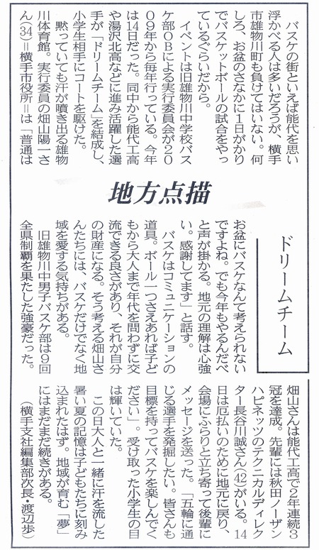 | ※雄物川ドリームチームの定義※ 雄物川中⇒能代工業へ進学した人を「雄物川ドリームチーム」とする。 尚、背番号は年齢順とさせて頂きました。 未参加の選手の番号はそのままパスしています。来年以降の参加をお待ちしています。 |